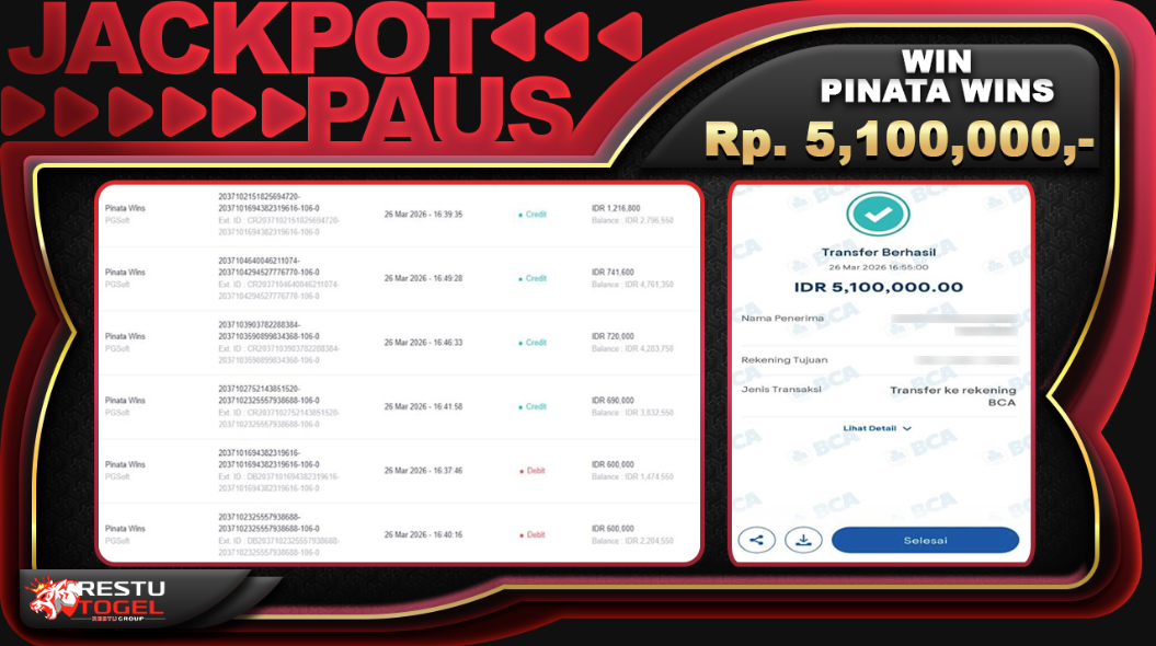 Kemenangan Rp. 5,100,000 dengan status LUNAS pada Kamis, 26 Maret 2026 menjadi bukti bahwa peluang jackpot bisa diraih dengan strategi dan pengelolaan modal yang tepat. Tetaplah bermain secara bijak dan jadikan permainan sebagai hiburan. Disiplin serta kontrol diri adalah kunci utama dalam meraih hasil maksimal.
