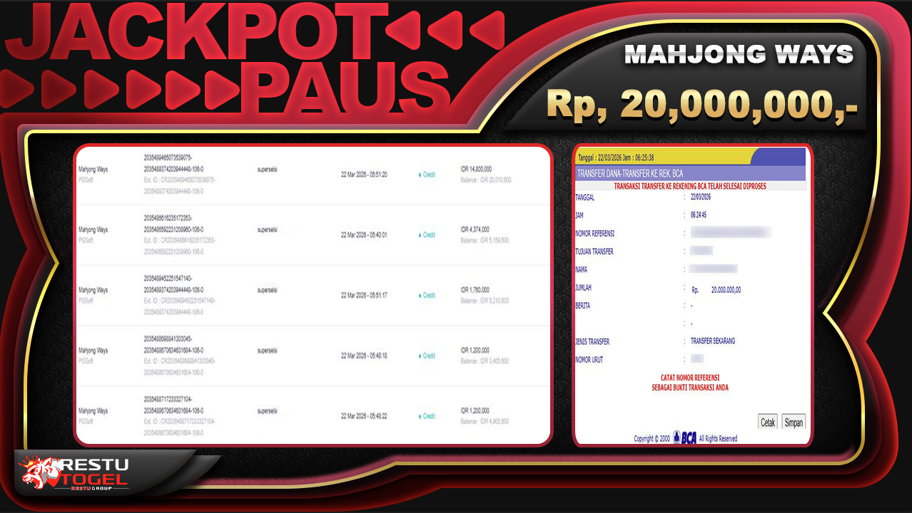Bukti Jackpot RESTUTOGEL Slot Online Minggu 22 Maret 2026 Rp. 20,000,000 – LUNAS.