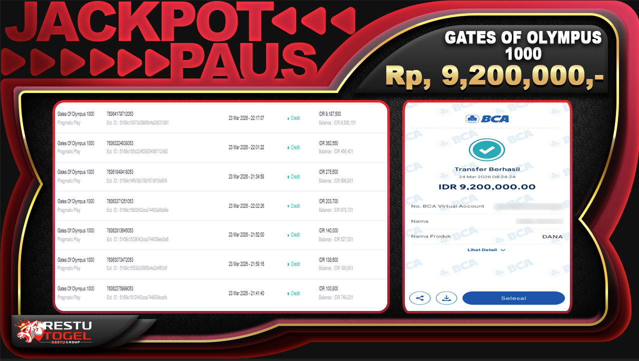 Kemenangan Rp. 9,200,000 dengan status LUNAS pada Rabu, 24 Maret 2026 menjadi bukti bahwa peluang jackpot bisa diraih dengan strategi dan pengelolaan modal yang tepat. Tetaplah bermain secara bijak dan jadikan permainan sebagai hiburan. Disiplin serta kontrol diri adalah kunci utama dalam meraih hasil maksimal.
