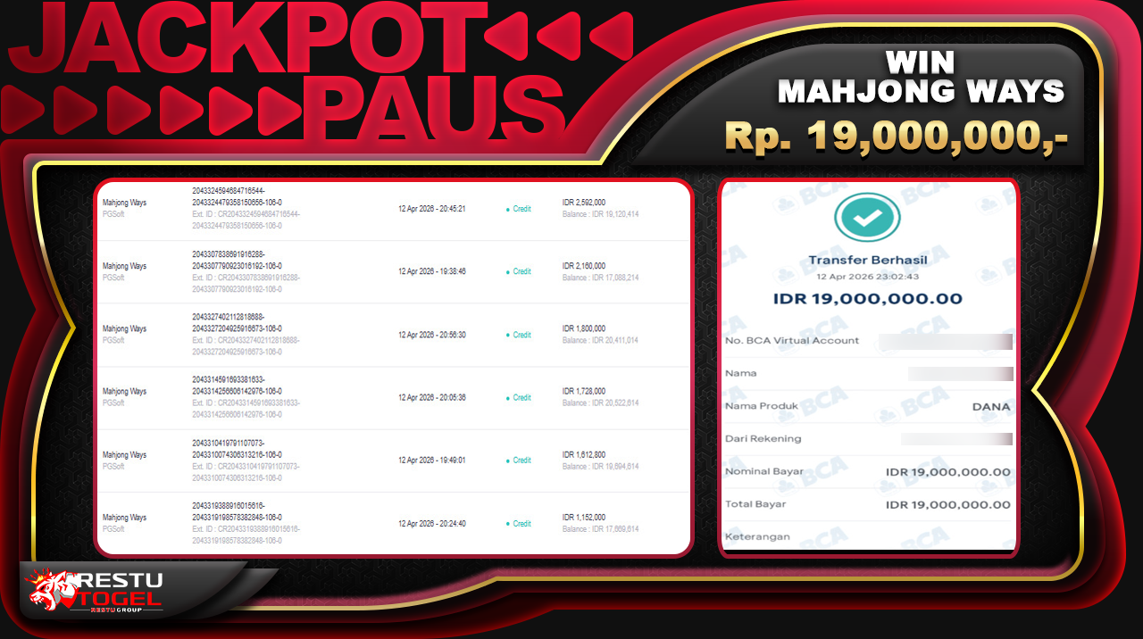 Kemenangan Rp. 19,000,000 dengan status LUNAS pada Senin , 13 April 2026 menjadi bukti bahwa peluang jackpot bisa diraih dengan strategi dan pengelolaan modal yang tepat. Tetaplah bermain secara bijak dan jadikan permainan sebagai hiburan. Disiplin serta kontrol diri adalah kunci utama dalam meraih hasil maksimal.