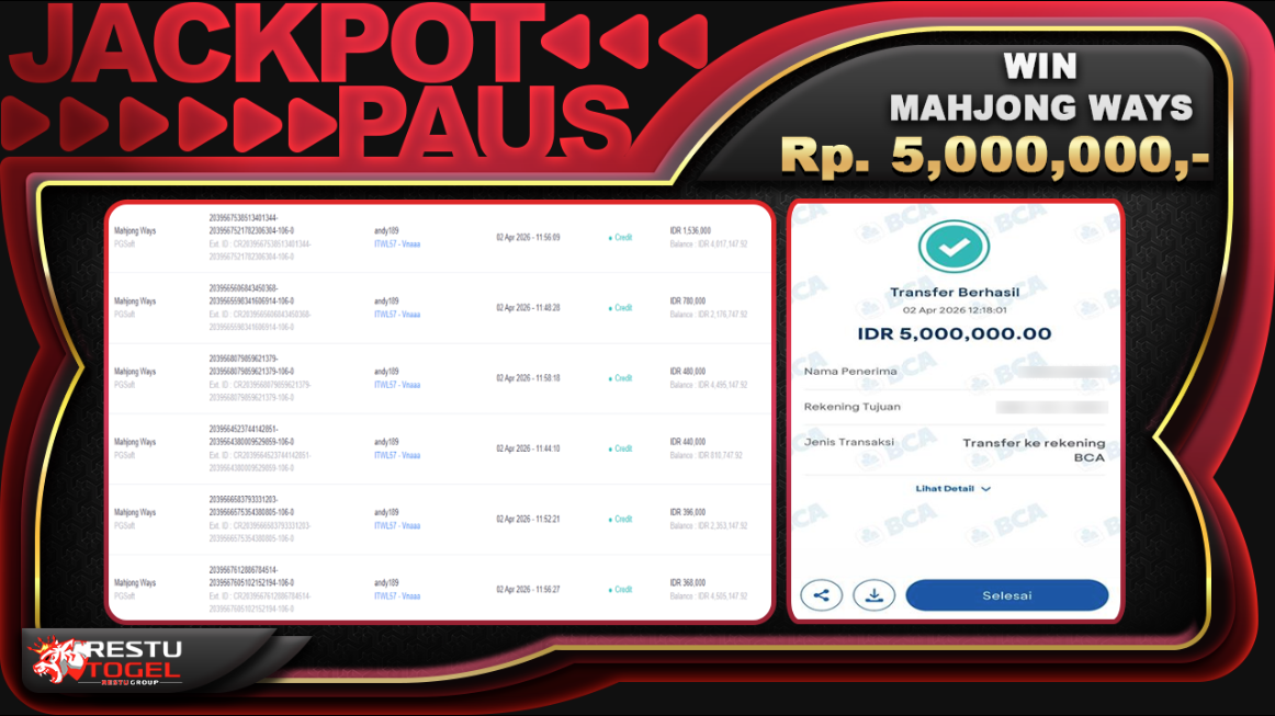 Kemenangan Rp. 5,000,000 dengan status LUNAS pada Kamis, 02 April 2026 menjadi bukti bahwa peluang jackpot bisa diraih dengan strategi dan pengelolaan modal yang tepat. Tetaplah bermain secara bijak dan jadikan permainan sebagai hiburan. Disiplin serta kontrol diri adalah kunci utama dalam meraih hasil maksimal.