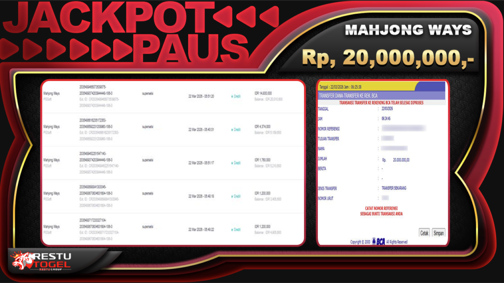 Bukti Jackpot RESTUTOGEL Slot Online Minggu 22 Maret 2026 – RESTUTOGEL merupakan situs togel online, slot online dan casino online terpercaya yang selalu bayar kemenangan member secara lunas. Keberuntungan besar kembali diraih oleh salah satu pemain pada Minggu, 22 Maret 2026 Dengan nominal taruhan yang relatif terjangkau, pemain berhasil mendapatkan kemenangan sebesar Rp. 20,000,000 dan…